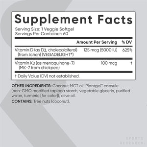 فيتامين د3 5000 وحدة مع ك2 100 ميكرو نباتي مع زيت جوز الهند 60 كبسولة Sports Research Vitamin D3+K2 MK7 with Coconut Oil (Best Before 01-02-2027)