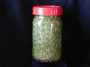 قم بقياس 3 ملاعق كبيرة من البذور لكل مرطبان سعة ربع جالون. - ضع غطاء/شاشة الإنبات أعلى المرطبان. اشطف البذور مرتين عن طريق ملء المرطبان بالماء وتحريكه وتصفيته. ثم املأ المرطبان إلى نصفه تقريبًا بالماء واترك الماء فيه. ثم ضعه في الثلاجة طوال الليل. (ينقع لمدة 8-10 ساعات تقريبًا).