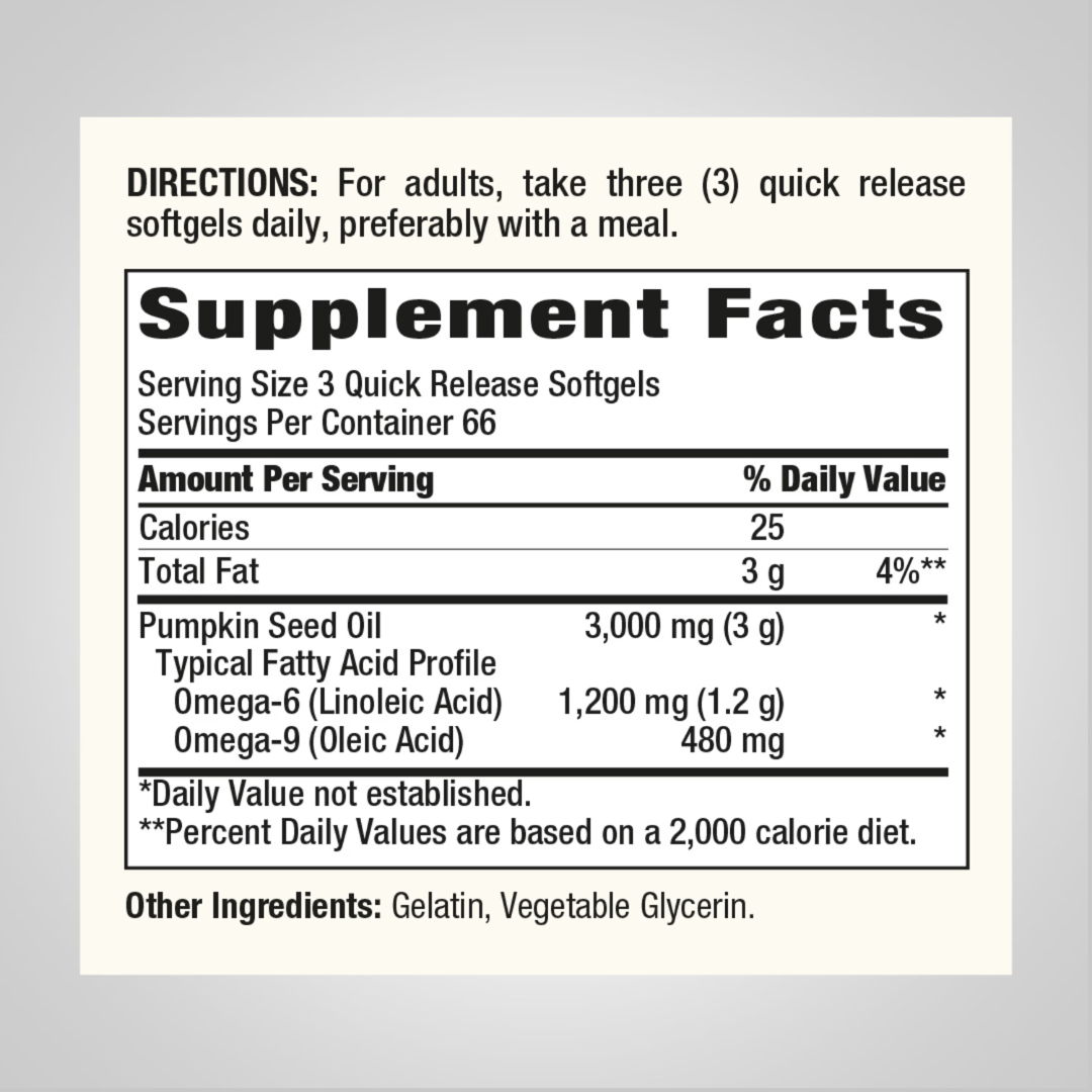 غالبًا ما يتم العثور عليه كزيت للطهي، تقدم Piping Rock الآن هذا الزيت الغذائي في كبسولات هلامية سريعة الإطلاق وسهلة البلع! توفر كل وجبة 3000 مجم من الزيت عالي الجودة المعصور على البارد من أجود بذور اليقطين. بالنسبة للبالغين، تناول ثلاث (3) كبسولات هلامية سريعة الإطلاق يوميًا، ويفضل أن يكون ذلك مع وجبة الطعام.
