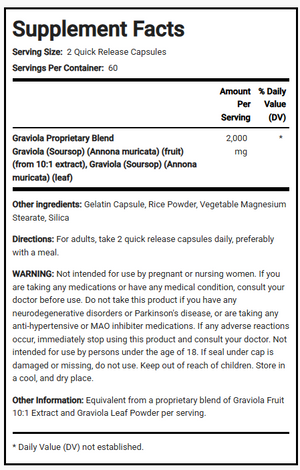 تحتوي أوراق هذه الشجرة الاستوائية على العديد من العناصر الغذائية المفيدة ووفرة من مضادات الأكسدة. كمكمل عشبي، تم استخدام الجرافيولا في أشكال عديدة مثل الكبسولات والمسحوق والأقراص والعصير.