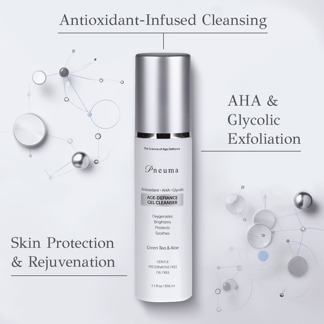 - المكونات: يحتوي منظف جل Pneuma المضاد للشيخوخة على مضادات الأكسدة وحمض ألفا هيدروكسي وجليكوليك والصبار والشاي الأخضر ومستخلصات الفاكهة والنباتات الطبيعية وهو لطيف ومناسب لجميع أنواع البشرة.